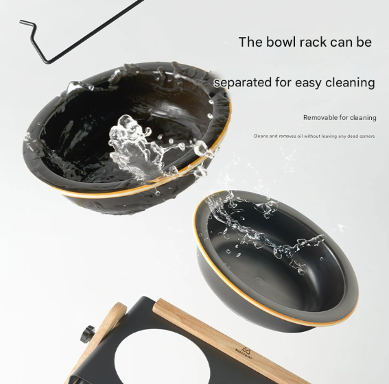 - Material: Metal Stand, Wood Legs, Food-Grade Bowls